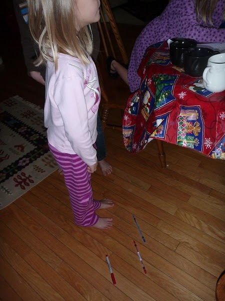 We measured the distance between the pencils for the three of us. For me it was 6 1/4 inches, for LD it was 5 1/4 inches and for DD it was 4 1/4 inches. We talked about why that was the case (the differences in our heights and the angle of our eyes to the penny).