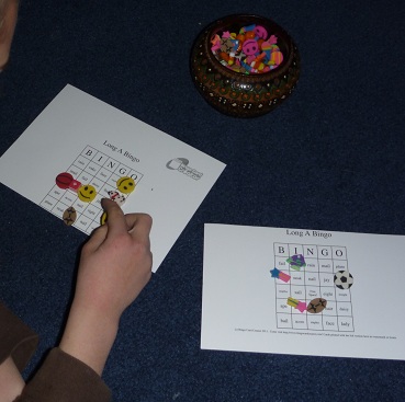 I found a bingo card creator and have made several cards so LD can do some reviewing. This is the “long A” sound words, but you can create any word list you want. Here is the link to the bingo card creator website.