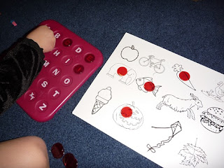 We’ve been also using it for ED’s preschool work. One day we turned over some Memory cards that we have. We took turns drawing a card and covering the first letter sound of the card we turned over.
