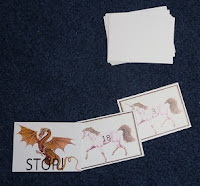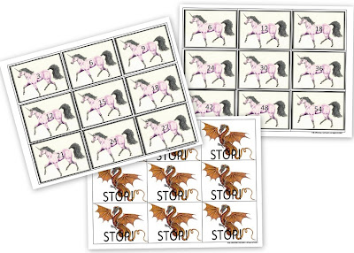 DD is just now learning to skip count by 3s. I made a unicorn and dragon themed game to help her practice. The game is pretty straight forward. Each player takes a turn drawing cards from the file until they get a dragon (STOP!) card. The player then sorts her cards and places them in skip counting order while the other player is drawing cards. The object is to be the first player to get all the cards needed and placed in the proper order — 3,6,9,12,15,18,21,24,27