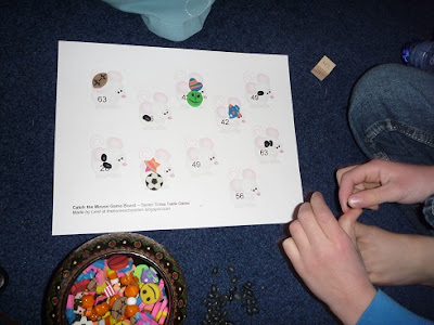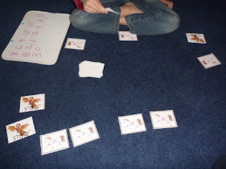 Meanwhile LD and I played “Catch the Mouse” for math (for multiplying by 6s). We have a die with the numbers 4 through 9. LD rolled the die (5) and multiplied that number by 6. Then he placed a marker on the mouse with the answer (30). The object is to try to capture the most mice by placing two markers on each mouse. If the other player has just one marker on the mouse, the player can bump him off the mouse, but once a player has two markers on a mouse, the mouse is his. You can download my Catch the Mouse game here (there’s a board for 6s and another for 7s).
