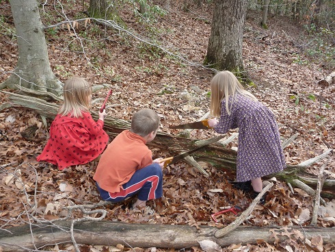 A couple days ago the kids decided they wanted to do some “hard work.” (I kind of wonder if that is because of all the books we’ve been reading together about life in the American West.) They all got saws and spent well over an hour cutting off branches. Since we had just talked about first aid, I asked them what they would do if they cut themselves badly on the saw. We talked about putting pressure on the wound and getting help from Mom immediately. A little while later they all came tramping in and demanded band-aids and other first aid gear to take out with them. Since then, they’ve been carrying around their own make-shift first aid kits whenever they go outside!
