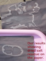 Before I had kids I used to teach high school history (and other subjects), but I sure don’t miss the stress or rush to get out the door. Our official (if you can call it that) school day usually starts around 10am with all of us gathering together for Collection–our group time. A lot of the time we start with a quick science experiment. Yesterday, for example, we were talking about why the ocean is salty. We went outside, got a shovel full of dirt, poured a couple teaspoons of salt on top of the dirt and then let it “rain” on the dirt. The water made its way down through the dirt and a coffee filter and we drizzled the water on black paper.