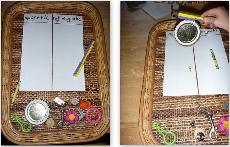 ED announced a week or two ago that she wants to be a scientist when she grows up. Hearing that, I realized it was time to start revisiting a lot of our past science experiments. I set out the simple Magnetic or Not Magnetic activity for her.