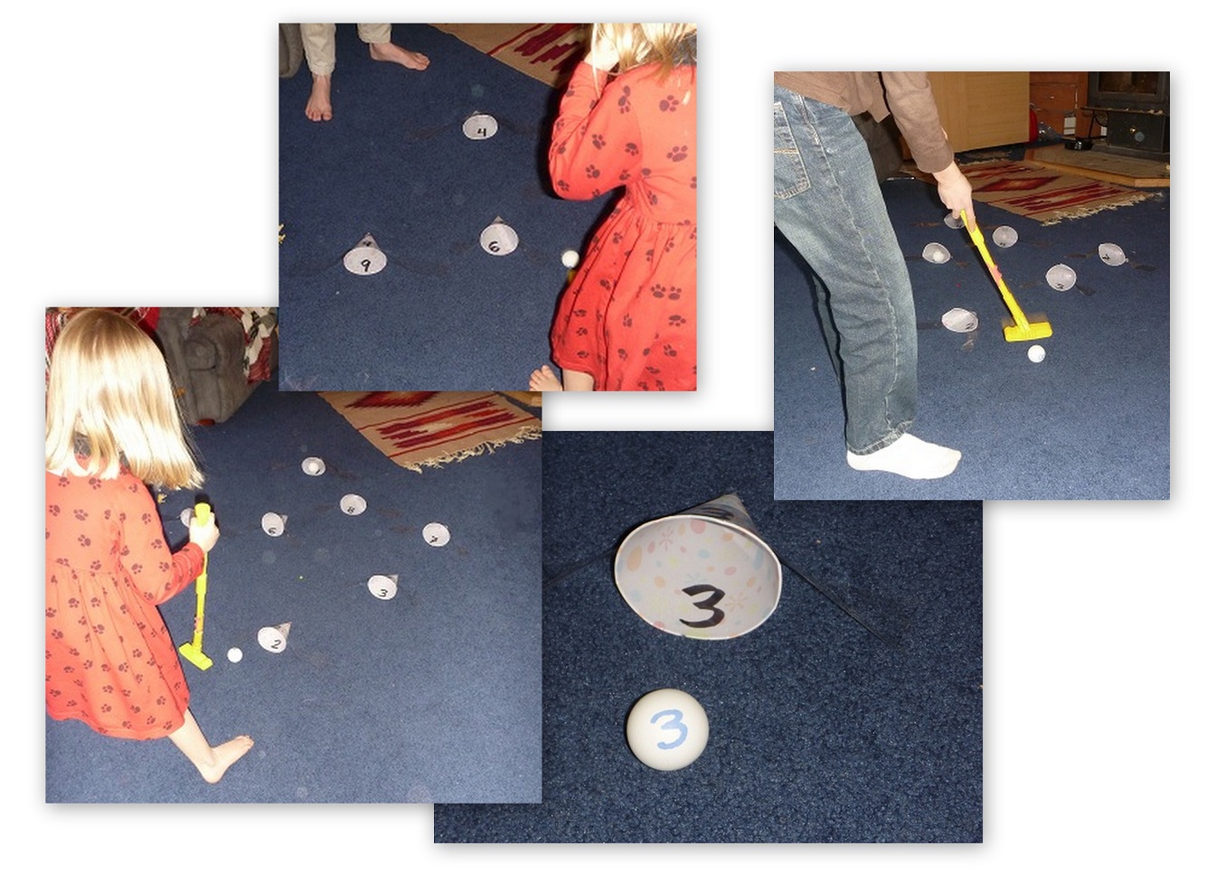 Mini Golf Math: I put some numbers on a set of ping pong balls and taped some cups to the floor. ED had to identify the number before she was allowed to hit the ball into the matching cup. Of course the older kids wanted a go as well, so DD doubled the number and LD squared the number before hitting it in.
