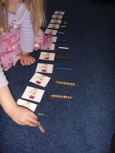 We incorporate a lot of Montessori math into our preschooling days. There are lots of great websites, but Living Montessori Now is a wonderful place to start as Deb has compiled ideas from all around the web. I also play lots of board games that require counting, we jump and play and sing about numbers. Here are some of the math activities we did a couple of weeks ago. I had this set to post, but am only just sharing it now.