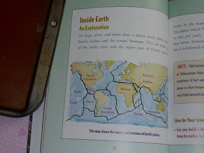 We put two crustal plates directly onto the red “mantle.” Then I pulled the plates apart and asked the kids what they saw. Obviously they saw the red “lava” and I talked about how new rocks are being formed all the time under the oceans (the Mid-Atlantic Ridge). I read that section from one of our science books. As Gardner’s book put it, “When two plates separate, there is a weakness in the Earth’s crust. Hot magma from the Earth’s mantle may come up between the plates. As the liquid magma cools, it adds new crust to the plates.” (p. 32, Earth Shaking Science Projects About Planet Earth)