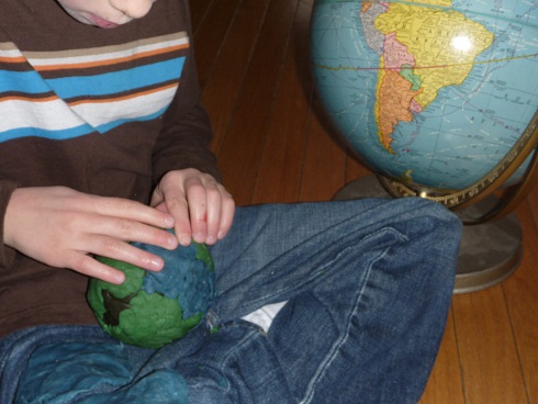 Then LD looked at the globe and tried to add the continents and oceans. Would you believe, poor LD’s place of birth, Australia, didn’t really fit onto his globe??! He stuck on a tiny, tiny piece of green playdough but it wasn’t much to scale!