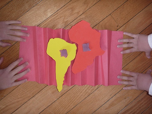 As the kids pulled each side of the construction paper, they could see the continents move apart. We got this idea from Robert Gardners” Earth-Shaking Science Projects About Planet Earth.