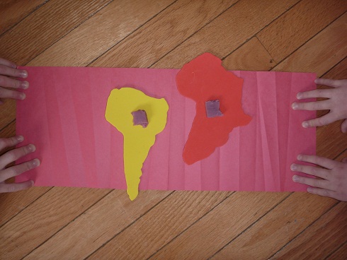 Next we did a little activity to show how continents could move without some giant hand pulling them apart. This was perfect for the kids, since it let them “see” the continents move without our touching them. I cut the continents out of foam. The kids folded construction paper. First we set the continents close together with a piece of playdough to weight the continents down.
