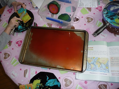 We put two crustal plates directly onto the red “mantle.” Then I pulled the plates apart and asked the kids what they saw. Obviously they saw the red “lava” and I talked about how new rocks are being formed all the time under the oceans (the Mid-Atlantic Ridge). I read that section from one of our science books. As Gardner’s book put it, “When two plates separate, there is a weakness in the Earth’s crust. Hot magma from the Earth’s mantle may come up between the plates. As the liquid magma cools, it adds new crust to the plates.” (p. 32, Earth Shaking Science Projects About Planet Earth)