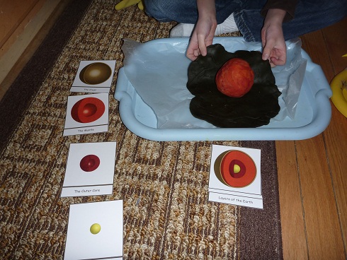 I first saw this activity last year at The Learning Ark. It fit in perfectly with our Earth Science unit. There is also a similar activity using a hard-boiled egg in the book we are using for this unit, How the Earth Works by Michelle O’Brien-Palmer. One of the other books we are using, Planet Earth/Inside Out by Gail Gibbons, had some really good description and discussion of the layers of the earth. We used those books along with cards from Free Montessori.org to talk about the inner core, out core, mantle and crust.
