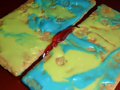 We put two crustal plates directly onto the red “mantle.” Then I pulled the plates apart and asked the kids what they saw. Obviously they saw the red “lava” and I talked about how new rocks are being formed all the time under the oceans (the Mid-Atlantic Ridge). I read that section from one of our science books. As Gardner’s book put it, “When two plates separate, there is a weakness in the Earth’s crust. Hot magma from the Earth’s mantle may come up between the plates. As the liquid magma cools, it adds new crust to the plates.” (p. 32, Earth Shaking Science Projects About Planet Earth)